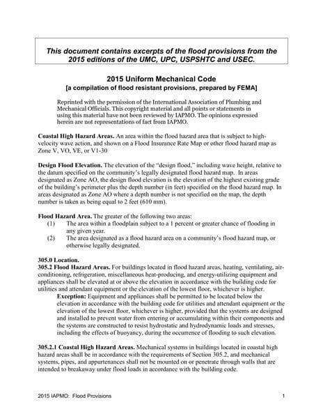 The document contains excerpts of flood provisions from the 2015 editions of the UMC, UPC, USPSHTC, and USEC related to building code requirements for flood hazard areas. It focuses on the elevation and construction requirements for various building components and systems within flood hazard areas to resist hydrostatic and hydrodynamic loads during flooding.