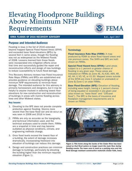 This resource provides guidance on elevating flood-prone buildings above minimum National Flood Insurance Program (NFIP) requirements to minimize flood damage. It discusses the importance of understanding Flood Insurance Rate Maps (FIRMs) and Base Flood Elevations (BFEs), and emphasizes the need for incorporating freeboard into building designs to enhance resilience against flooding.