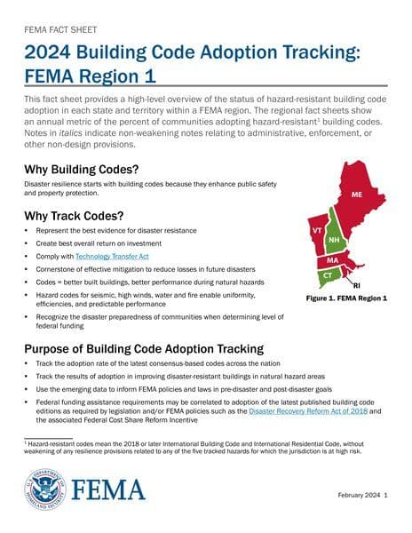 The resource is a FEMA fact sheet providing a high-level overview of hazard-resistant building code adoption in FEMA Region 1. It emphasizes the importance of building codes in disaster resilience and explains the purpose of tracking building code adoption. The fact sheet highlights the role of FEMA in proposing and defending building code changes to enhance disaster resistance and improve public safety.