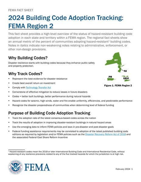 The resource provides an overview of hazard-resistant building code adoption in FEMA Region 2. It highlights the importance of building codes in disaster resilience and explains the significance of tracking code adoption for enhancing public safety and property protection. The fact sheet outlines the role of building codes in disaster resistance, return on investment, and mitigation efforts. It also discusses the purpose of tracking code adoption, including informing FEMA policies and laws related to disaster recovery and federal funding assistance requirements.