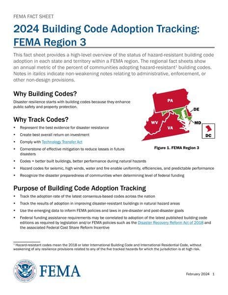 The FEMA fact sheet provides an overview of the 2024 Building Code Adoption Tracking in FEMA Region 3 states and territories. It emphasizes the importance of hazard-resistant building codes in enhancing public safety and property protection. The document details the purpose of tracking building code adoption, which includes improving disaster-resistant buildings, informing FEMA policies, and correlating federal funding assistance to code adoption. It also outlines FEMA's continuous role in proposing and defending against building code changes to maintain consistency with programs like the National Flood Insurance Program and to enhance disaster resilience.