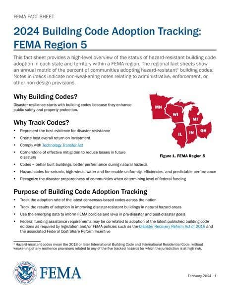 The FEMA fact sheet provides an overview of the Building Code Adoption Tracking in FEMA Region 5. It highlights the importance of building codes in disaster resilience by enhancing public safety and property protection. The fact sheet explains the significance of tracking building codes as a means to improve disaster-resistant buildings in natural hazard areas and inform FEMA policies and laws. It also emphasizes the correlation between federal funding assistance requirements and the adoption of the latest building code editions.