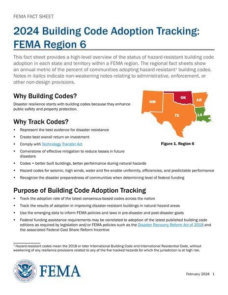 The resource is a FEMA fact sheet providing an overview of hazard-resistant building code adoption in FEMA Region 6. It emphasizes the importance of building codes in disaster resilience and public safety. The fact sheet tracks the adoption rate of consensus-based codes, identifying the jurisdictions adopting hazard-resistant building codes to improve disaster-resistant structures in high-risk areas. The document outlines FEMA's role in proposing, defending, and supporting building code changes to maintain consistency with the National Flood Insurance Program and enhance post-disaster practices.