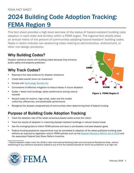The resource is a FEMA fact sheet providing an overview of hazard-resistant building code adoption in FEMA Region 9 states and territories. It emphasizes the importance of building codes for disaster resilience, the tracking of codes, and their role in disaster-resistant building construction. The fact sheet details the adoption rates of hazard-resistant codes, the purpose of tracking these codes, and how the data is used to inform FEMA policies and laws. It also highlights FEMA's continuous role in proposing building code changes, defending against weakening provisions, and supporting training initiatives for officials.
