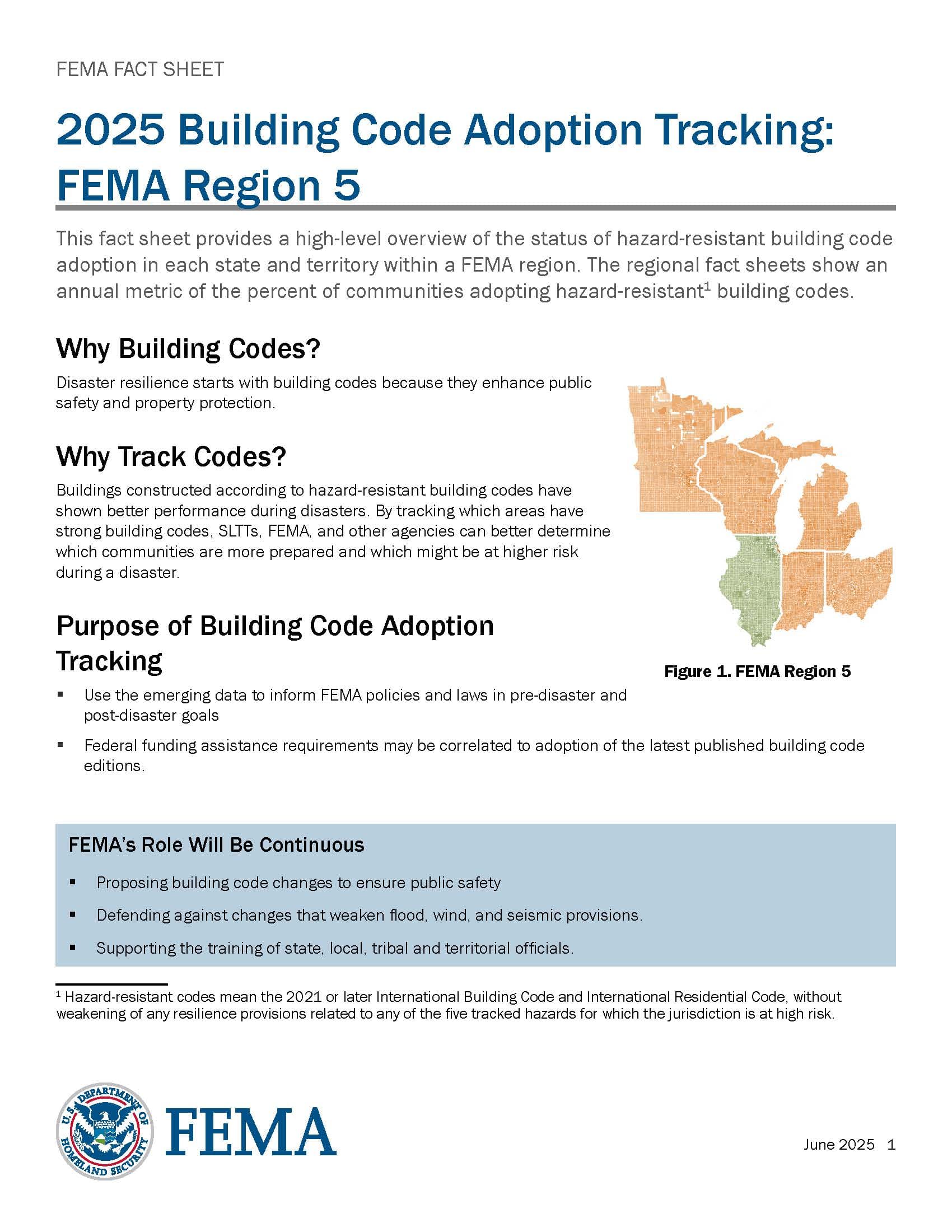 This fact sheet provides a high-level overview of the status of hazard-resistant building code adoption in each state and territory within FEMA Region 5. The regional fact sheets show an annual metric of the percent of communities adopting hazard-resistant building codes.