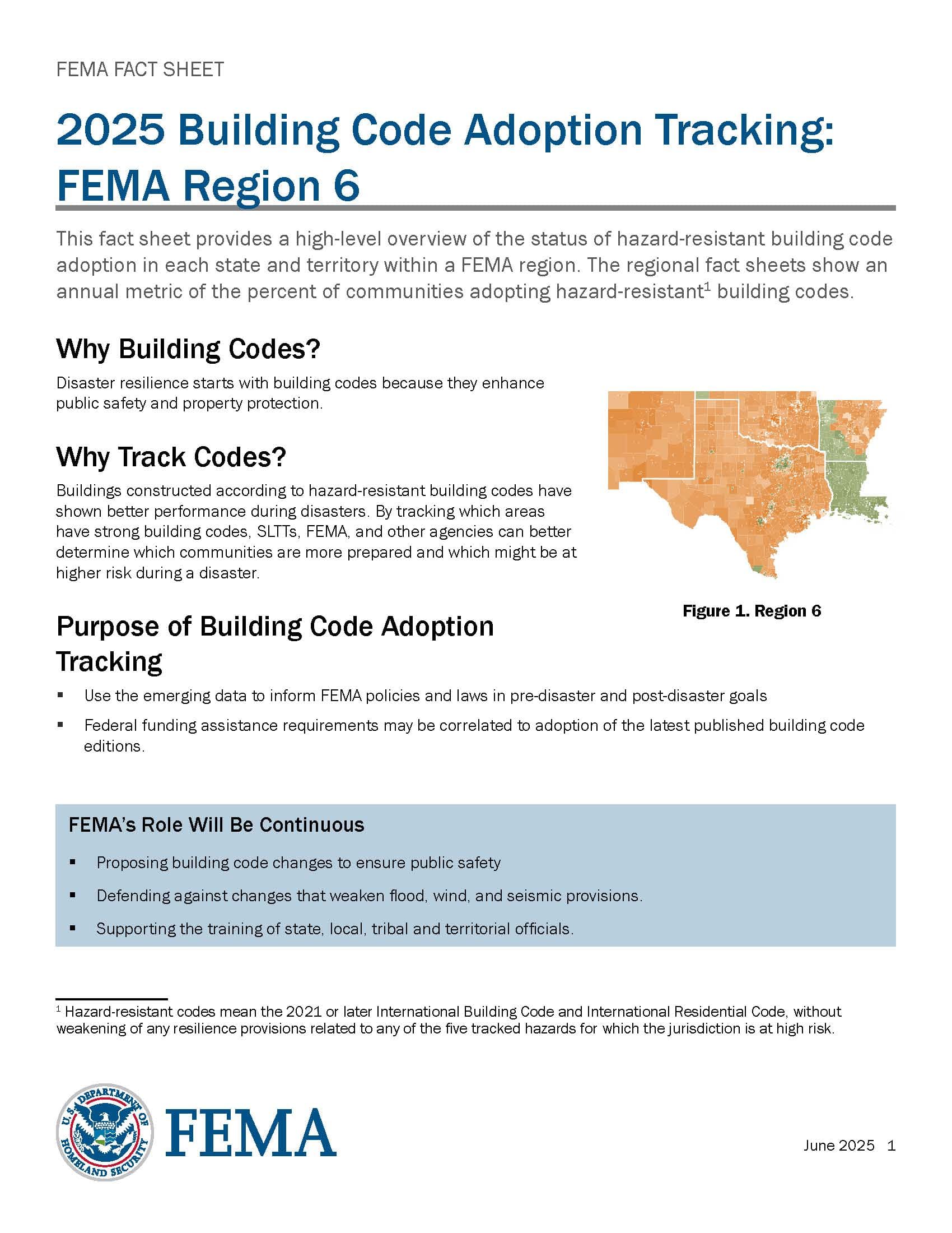 This fact sheet provides a high-level overview of the status of hazard-resistant building code adoption in each state and territory within FEMA Region 6. It includes an annual metric of the percent of communities adopting hazard-resistant building codes, highlighting the importance of building codes in enhancing public safety and property protection.