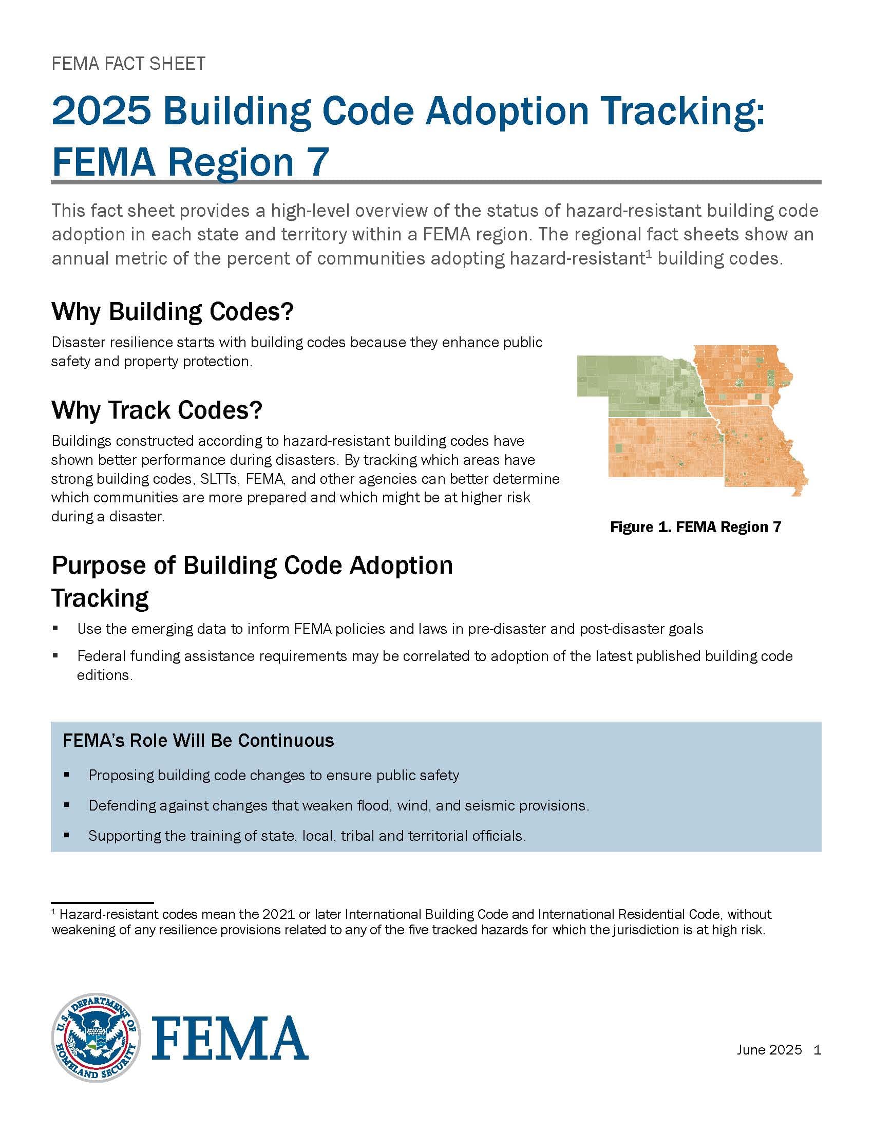 This fact sheet provides a high-level overview of the status of hazard-resistant building code adoption in each state and territory within FEMA Region 7. It includes metrics on the percentage of communities adopting these codes and highlights the importance of building codes in enhancing disaster resilience.