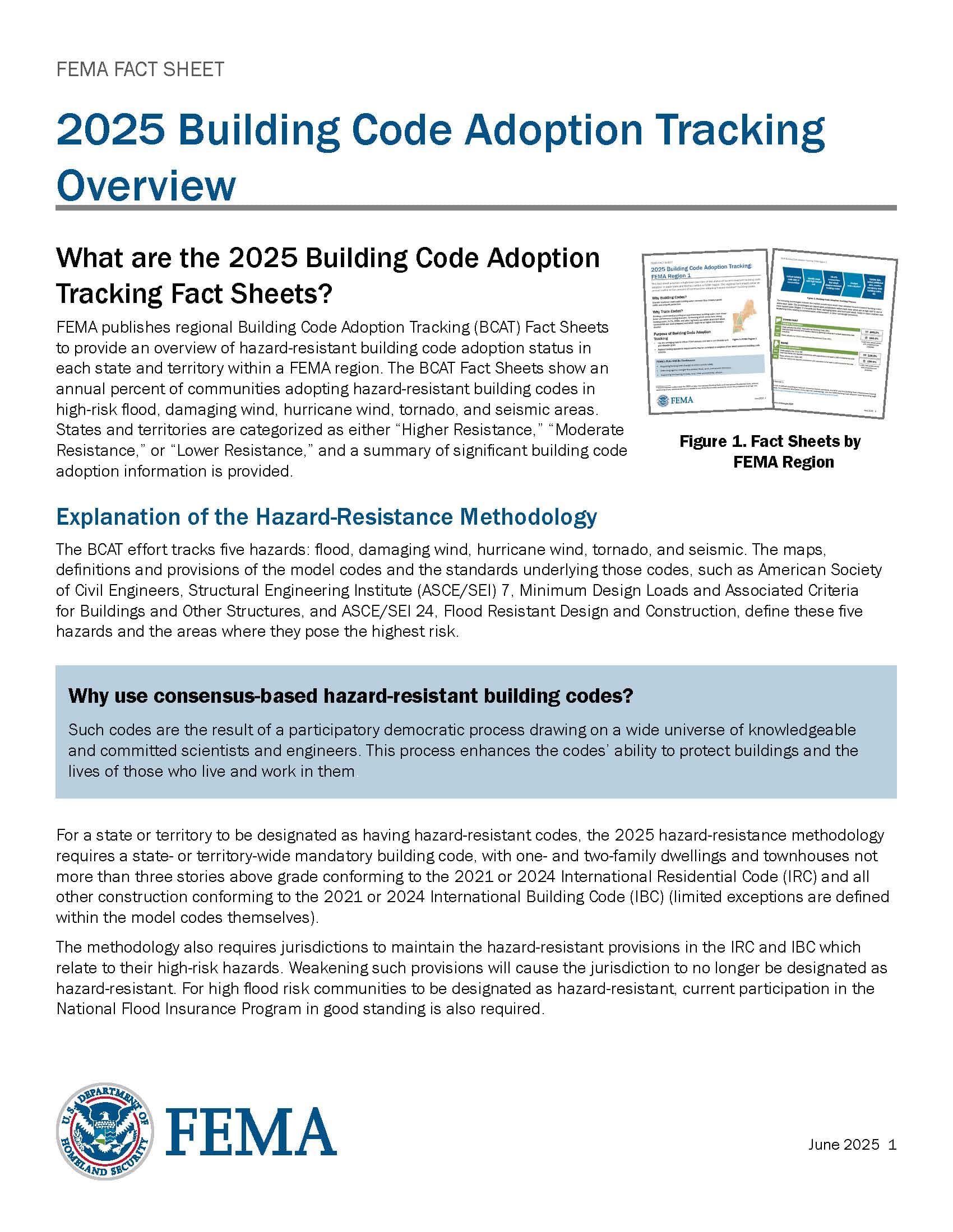 FEMA publishes regional Building Code Adoption Tracking (BCAT) Fact Sheets to provide an overview of hazard-resistant building code adoption status in each state and territory within a FEMA region. This overview explains the methodology behind the regional reports.