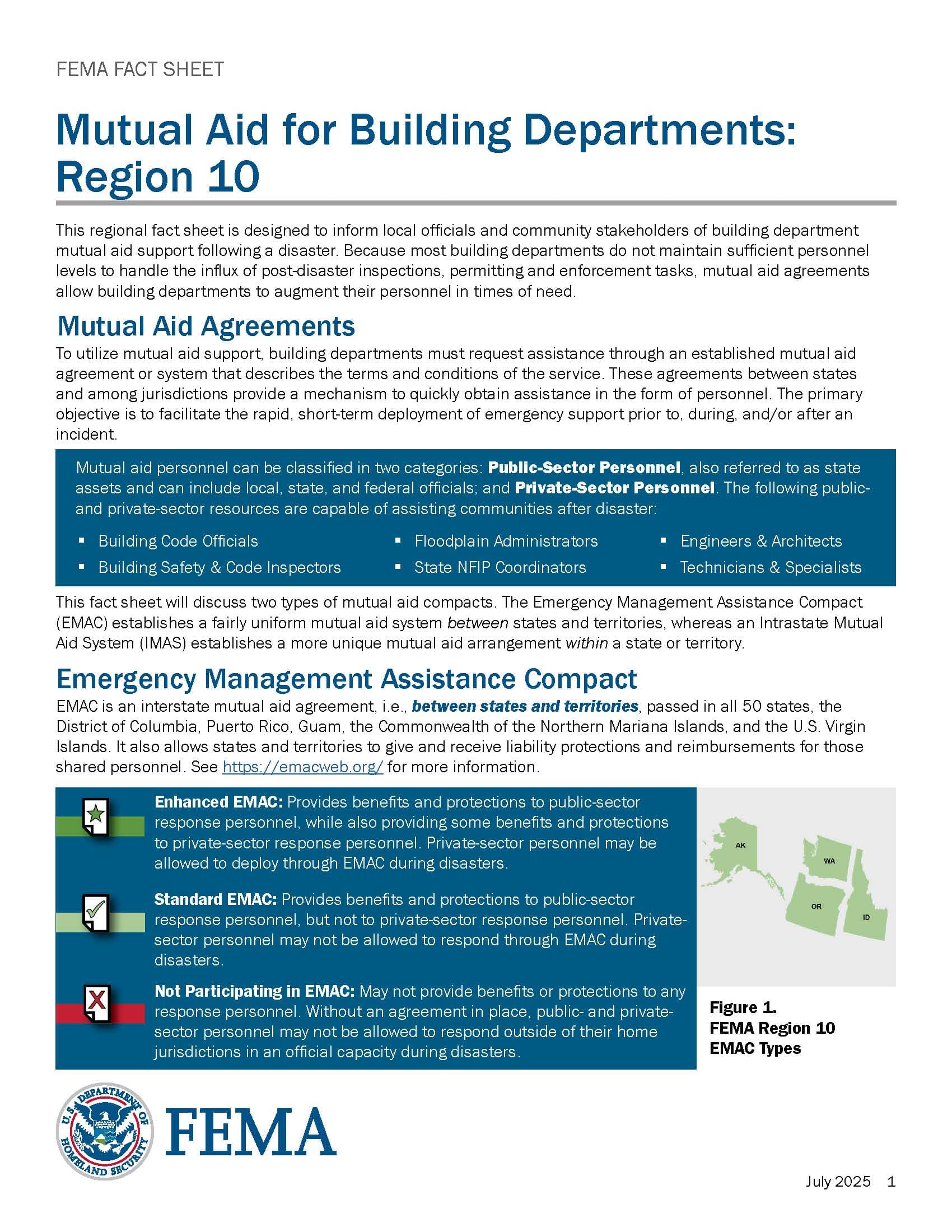 This regional fact sheet is designed to inform local officials and community stakeholders of building department mutual aid support following a disaster. Because most building departments do not maintain sufficient personnel levels to handle the influx of post-disaster inspections, permitting and enforcement tasks, mutual aid agreements allow building departments to augment their personnel in times of need.