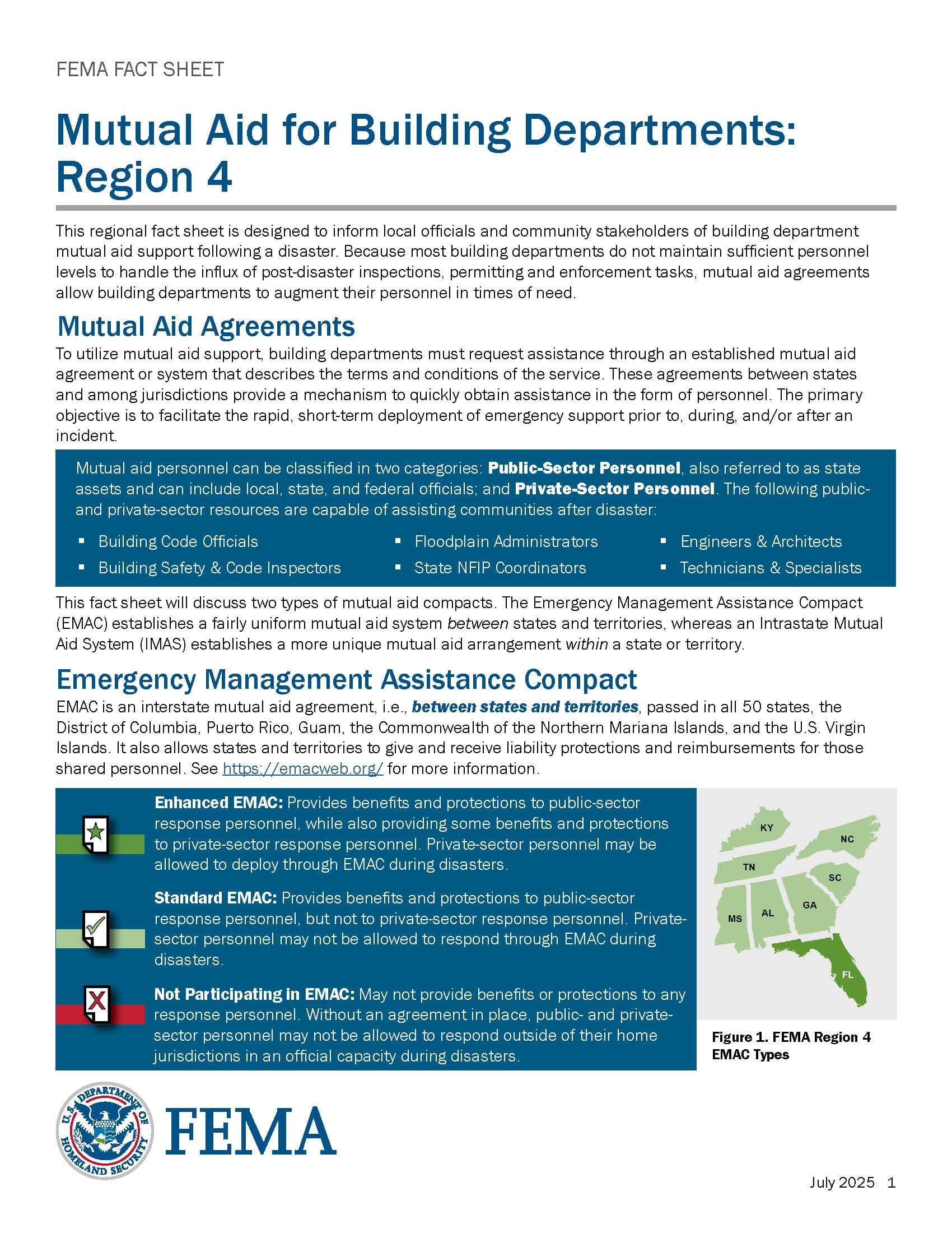 This regional fact sheet informs local officials and community stakeholders about building department mutual aid support following a disaster. It highlights the importance of mutual aid agreements for augmenting personnel to handle post-disaster tasks such as inspections, permitting, and enforcement. The document explains the mechanisms of mutual aid agreements, including the Emergency Management Assistance Compact (EMAC) and Intrastate Mutual Aid Systems (IMAS), and provides guidance on utilizing these resources effectively.