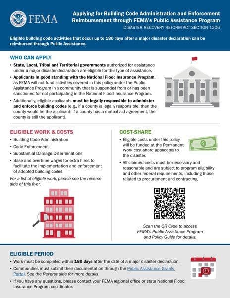 This resource provides guidance on applying for reimbursement of building code administration and enforcement activities through FEMA's Public Assistance Program, as outlined in the Disaster Recovery Reform Act Section 1206. It covers eligibility criteria, eligible work and costs, cost-share details, and the application process for state, local, tribal, and territorial governments following a major disaster declaration.