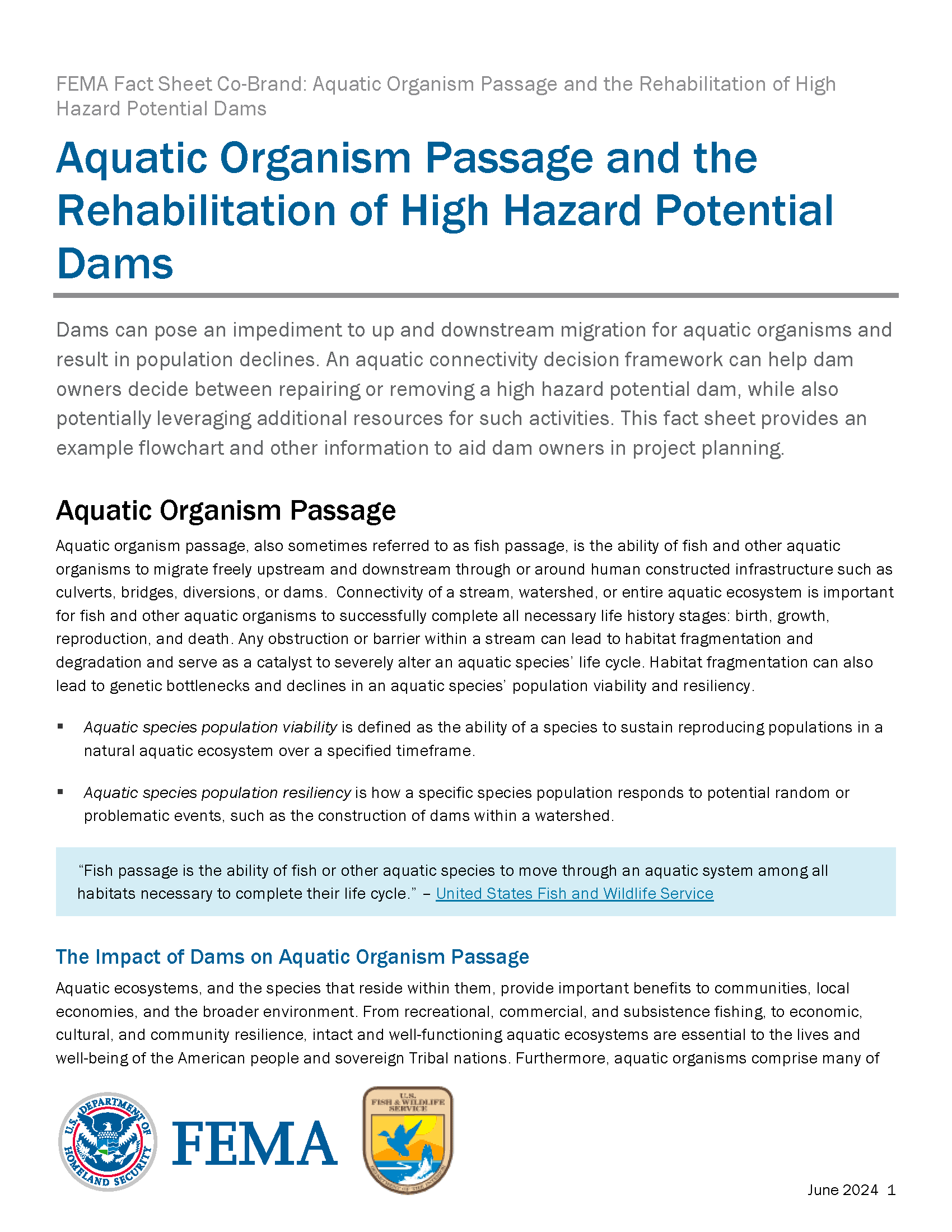 Dams can pose an impediment to up and downstream migration for aquatic organisms and result in population declines. An aquatic connectivity decision framework can help dam owners decide between repairing or removing a high hazard potential dam, while also potentially leveraging additional resources for such activities. This fact sheet provides an example flowchart and other information to aid dam owners in project planning.