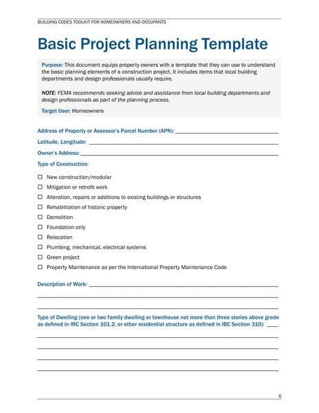 The Basic Project Planning Template (FEMA P-2325) is a resource designed to assist property owners in understanding the fundamental planning elements of a construction project. It outlines the necessary items typically required by local building departments and design professionals, and emphasizes the importance of consulting these entities during the planning process. The template is particularly aimed at homeowners and includes sections on construction types, hazard indicators, building permits, and inspection schedules.