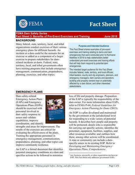 The FEMA Dam Safety Series Fact Sheet 3 highlights the importance of pre-event exercises and training for dam safety and emergency preparedness. It discusses various types of exercises, such as tabletop, functional, and full-scale exercises, and emphasizes the evaluation of Emergency Action Plans (EAPs) and Emergency Operations Plans (EOPs) to identify strengths and areas for improvement. The document provides examples of pre-event exercises and training efforts, underscoring the need for stakeholders to be prepared for dam-related incidents.