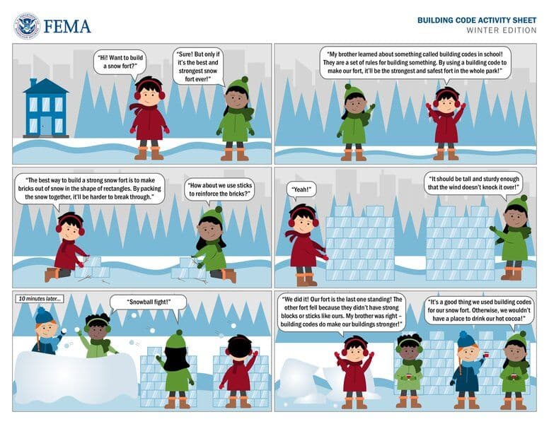 The winter edition building code activity sheet features a story where kids construct a snow fort using building codes to make it strong and safe. The narrative emphasizes the importance of following rules while building to ensure durability and safety. It concludes with the fort standing after a snowball fight, highlighting the effectiveness of building codes in creating resilient structures.