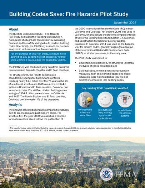 The Building Codes Save (BCS) Fire Hazards Pilot Study evaluates the financial and life safety savings resulting from modern building codes in California and Colorado, focusing on structure fire and wildfire hazards. The study demonstrates considerable savings due to modern codes in both residential structures and properties over their useful life. Comparisons were made between pre-modern and post-modern codes, using years like 2000 and 2008 for structure fire and 2014 for wildfire as baseline years for the analysis.
