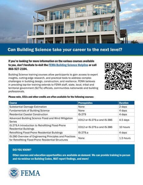 The Building Science Training Flyer provides information on various courses offered by FEMA to enhance skills in building design, construction, and resilience. These courses are designed for FEMA staff, state, local, tribal, and territorial government officials, communities, and building professionals. Participants can earn CEUs and other credits through these training programs.