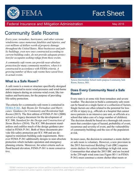 The Community Safe Room Fact Sheet provides detailed information on the construction and importance of community safe rooms for protection during extreme wind events like tornadoes and hurricanes. It outlines the criteria for safe room construction as per FEMA P-361 and ICC 500 standards, discusses the role of risk assessments, voluntary construction decisions, and funding sources, including federal and state programs. The document also highlights the involvement of Hazard Mitigation Officers in planning and funding, the multipurpose use of safe rooms, and considerations for flooding hazards to ensure occupant safety.