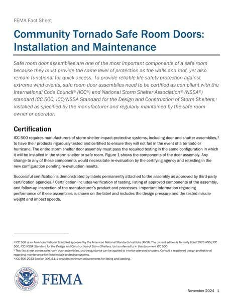 The FEMA Fact Sheet provides detailed guidance on the installation and maintenance of Community Tornado Safe Room Doors, emphasizing the importance of certified door assemblies compliant with the ICC 500 standard to ensure protection against extreme wind events. It covers certification, installation requirements, maintenance procedures, and offers guidance specific to residential safe room doors.