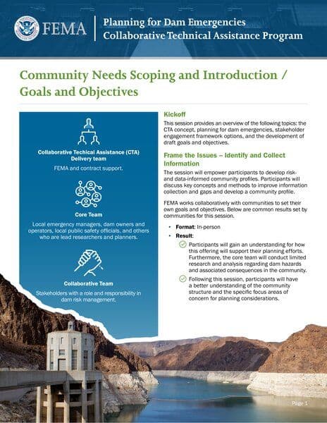 The resource provides an overview of planning for dam emergencies as part of the Collaborative Technical Assistance Program. It covers topics such as the CTA concept, stakeholder engagement, development of draft goals and objectives, risk and data-informed community profiles, and collaborative efforts between FEMA, communities, and stakeholders to improve dam emergency planning and preparedness.