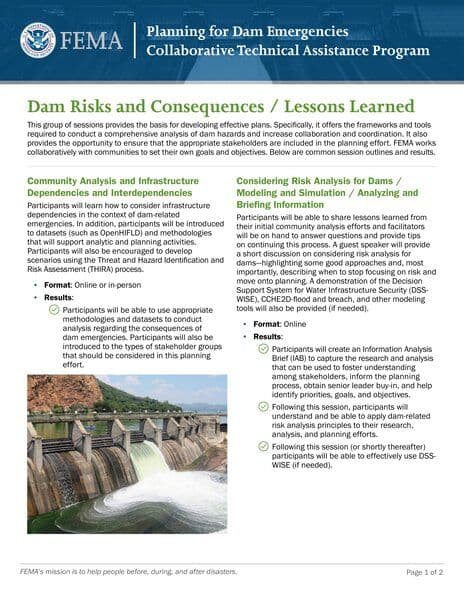 The CTA-2 Dam Risk Consequences/Lessons Learned resource provides a comprehensive framework for planning and analyzing dam-related emergencies. It emphasizes the importance of understanding infrastructure dependencies, utilizing datasets and methodologies for risk assessment, and fostering collaboration among stakeholders. The program includes sessions on risk analysis, modeling, and simulation, as well as best practices for dam operation and maintenance. Participants will gain the skills needed to conduct effective outreach and develop emergency action plans.