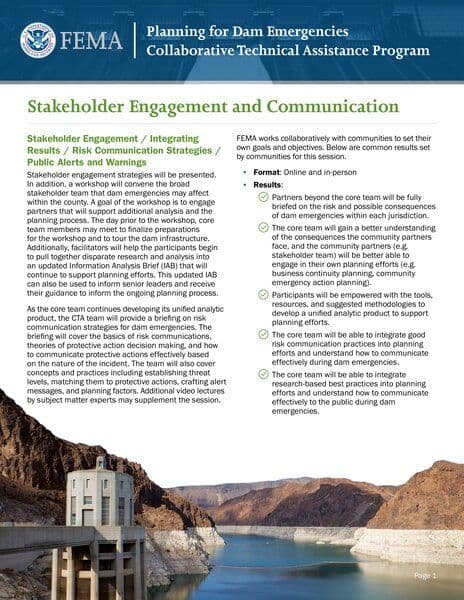 The resource provides details on planning for dam emergencies, focusing on stakeholder engagement, risk communication strategies, public alerts and warnings, and collaborative workshops. It discusses the goals of workshops, core team preparation, infrastructure tours, updated information analysis briefs, and risk communication strategies for dam emergencies. The document emphasizes empowering participants with tools and resources to support planning efforts, integrating good risk communication practices, and communicating effectively during dam emergencies.