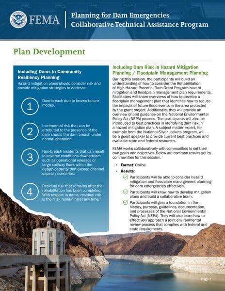 The resource discusses planning for dam emergencies as part of hazard mitigation plans and floodplain management planning. It emphasizes the importance of considering dam risks such as dam breaches, incremental risks attributed to dams, non-breach incidents downstream, and residual risks even after rehabilitation has been completed. The document also covers how participants can develop mitigation plans, understand the National Environmental Policy Act (NEPA) process, and identify dam risk in hazard mitigation planning.