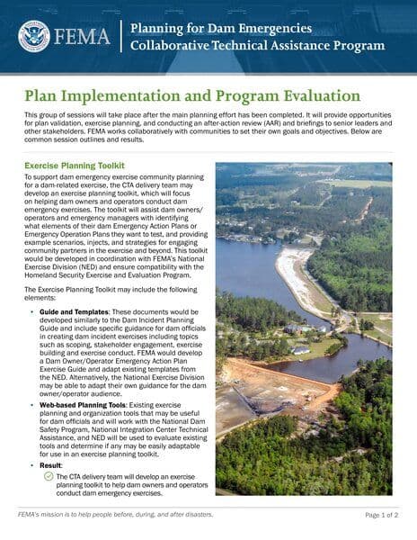 The resource provides information on FEMA's Collaborative Technical Assistance Program for Planning for Dam Emergencies. It highlights the development of an Exercise Planning Toolkit to assist dam owners and operators in conducting dam emergency exercises. The toolkit includes elements such as guides, templates, web-based planning tools, and sessions for plan implementation and program evaluation. It emphasizes the importance of partnerships between stakeholders, risk communication strategies, training on dam failure scenarios, and the development of new or revised plans and assessments to address dam-related emergencies.