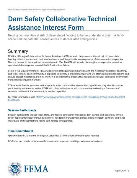 The Dam Safety Collaborative Technical Assistance Interest Form is designed for communities at risk of dam-related flooding. This initiative by FEMA aims to help these communities understand their risk landscape and the potential consequences of dam-related emergencies. The program offers expertise, coaching, and tools to assist in planning for emergencies related to operational discharges or dam infrastructure failure. It is a collaborative effort, requiring active participation from communities to customize sessions based on their capabilities and readiness.