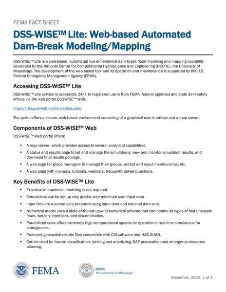 DSS-WISE™ Lite is a web-based automated two-dimensional dam-break flood modeling and mapping tool developed by the National Center for Computational Hydroscience and Engineering at the University of Mississippi, with support from FEMA. The tool provides a range of capabilities such as automatic preparation of input files, high-speed computational simulations for emergencies, and the production of geospatial results compatible with GIS software and HAZUS-MH. It is used for hazard classification, ranking, priority setting, emergency action plan preparation, and response planning.