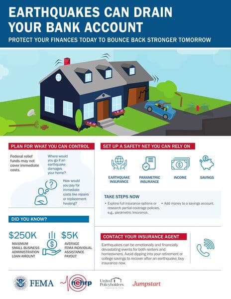 The resource provides guidance on protecting finances in the event of an earthquake. It emphasizes the importance of planning for immediate costs that may not be covered by federal relief funds, such as repairs or replacement housing. It suggests setting up a safety net through insurance, savings, and parametric options to ensure financial resilience after an earthquake.