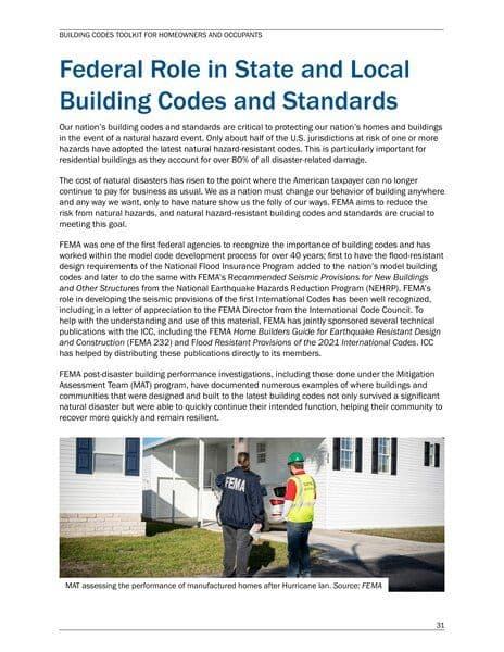 The resource discusses the critical role of building codes and standards in protecting homes and buildings during natural hazard events. It highlights FEMA's efforts in promoting natural hazard-resistant building codes and the importance of their adoption and enforcement at the state and local levels. Several studies are referenced to demonstrate the benefits of adhering to modern building codes, including significant cost savings and improved resilience.
