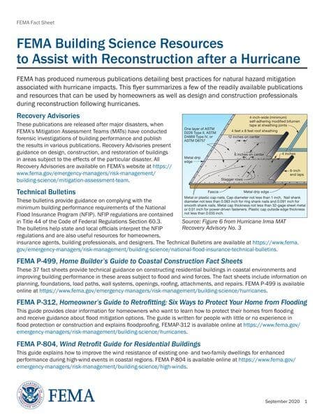 The FEMA Building Science Resources provide detailed guidance and best practices for natural hazard mitigation associated with hurricane impacts. The resources include recovery advisories, technical bulletins, fact sheets, and guides that offer information on design, construction, and retrofitting of buildings to enhance their performance in coastal regions prone to hurricanes. These resources are aimed at assisting homeowners, design and construction professionals, insurance agents, and state and local officials during the reconstruction process following hurricanes.