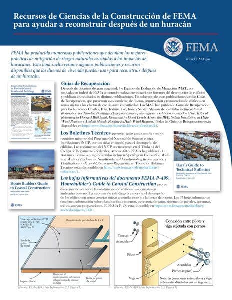 The FEMA Building Science Resources aim to assist homeowners in rebuilding after hurricanes by providing guidance on design, construction, and restoration of buildings in disaster-affected areas. Publications include Recovery Guides, Technical Bulletins, and Information Sheets that cover topics such as flood restoration, foundation wall openings, non-residential floodproofing, building utilities protection, retrofitting homes against flooding, and constructing coastal buildings. These resources emphasize design and construction practices to enhance building performance in coastal environments prone to flooding and high winds.