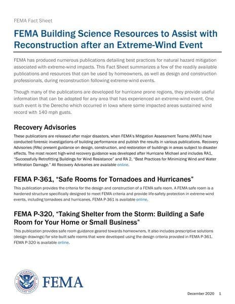 The FEMA Fact Sheet from December 2020 provides comprehensive information on Building Science resources to aid reconstruction after extreme-wind events. It includes guidelines and best practices for mitigating wind impacts, such as design and construction techniques, retrofitting buildings, and safe room criteria for tornadoes and hurricanes. The document also covers coastal construction guidance, wind retrofit guides, and vulnerability assessments for critical facilities, referencing standards like the International Residential Code (IRC) and prescriptive methods for enhancing wind resistance in residential buildings.