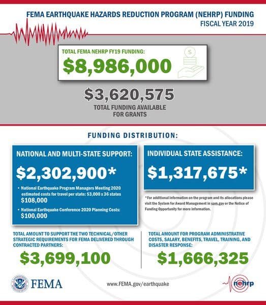 The FEMA NEHRP Funding Breakdown Infographic provides a detailed overview of the funding distribution for the National Earthquake Hazards Reduction Program (NEHRP) for the fiscal year 2019. It includes allocations for national and multi-state support, individual state assistance, technical and strategic requirements, and program administrative costs.
