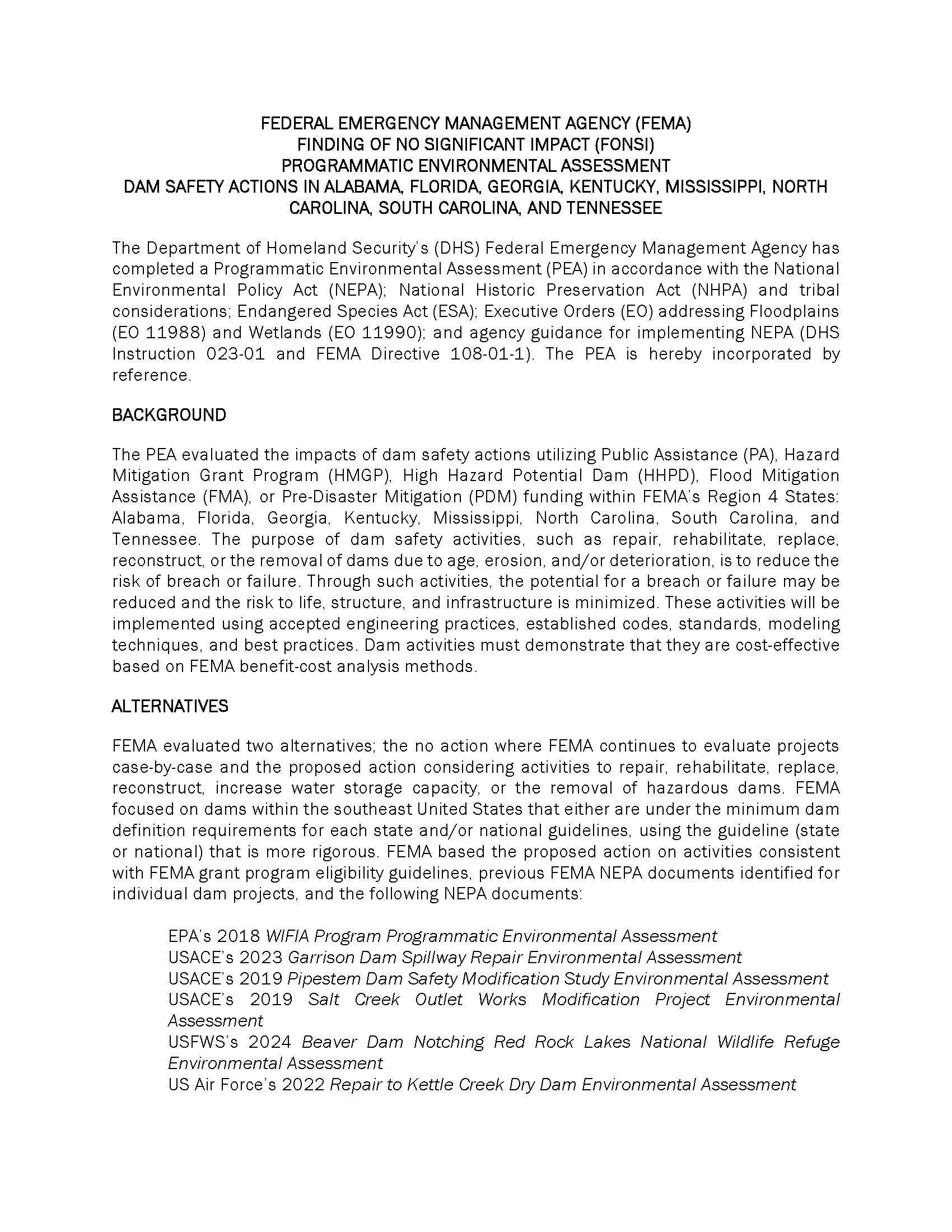 The Department of Homeland Security’s (DHS) Federal Emergency Management Agency has completed a Programmatic Environmental Assessment (PEA) for dam safety actions in FEMA Region 4. This assessment complies with various environmental and preservation acts and executive orders, and it evaluates the impacts of dam safety actions such as repair, rehabilitation, replacement, reconstruction, or removal of dams. The PEA aims to reduce the risk of dam breaches or failures, thereby minimizing risks to life, structures, and infrastructure.