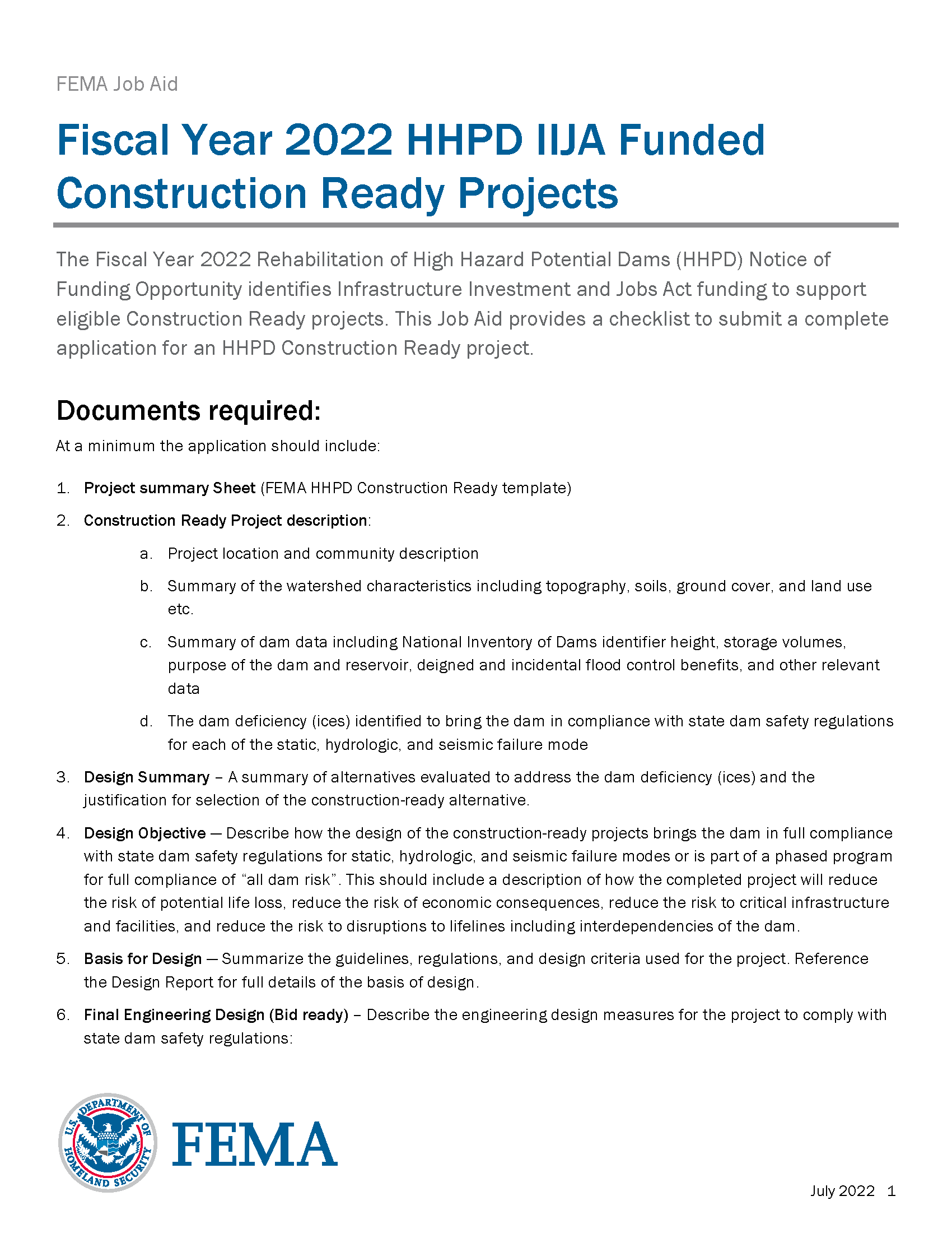 The Fiscal Year 2022 Rehabilitation of High Hazard Potential Dams (HHPD) Notice of Funding Opportunity identifies Infrastructure Investment and Jobs Act funding to support eligible Construction Ready projects. This Job Aid provides a checklist to submit a complete application for an HHPD Construction Ready project.