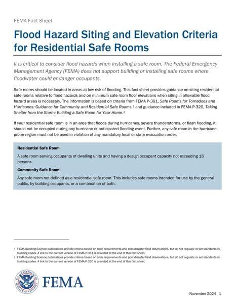 The FEMA Fact Sheet from November 2024 discusses Flood Hazard Siting and Elevation Criteria for Residential Safe Rooms. It emphasizes the importance of considering flood hazards when installing safe rooms and provides guidance on siting residential safe rooms relative to flood hazards. The fact sheet outlines the requirements for safe room locations, including restrictions in high hazard areas and elevation criteria based on flood zones. It also mentions the FEMA publications P-361 and P-320 as sources of criteria and guidance for safe room construction.