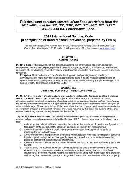 The resource provides detailed information on flood-resistant design and construction requirements based on various codes including the International Building Code, International Mechanical Code, International Plumbing Code, International Fuel Gas Code, and International Fire Code. It covers issues related to structural and mechanical systems, equipment, and appliances in flood hazard areas. The text includes specific provisions, exceptions, and requirements for ensuring compliance with flood resilience standards in building and infrastructure projects.