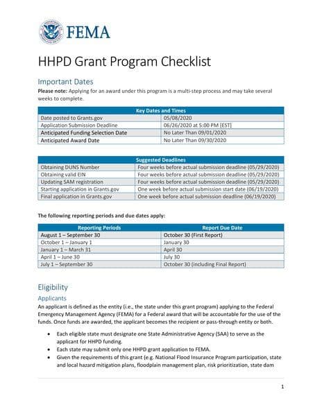 The HHPD Grant Program Checklist provides comprehensive guidance on the application process for the High Hazard Potential Dam (HHPD) Grant Program. It includes key dates, eligibility criteria for applicants and subrecipients, pass-through requirements, necessary application documents, and actions required for applying and receiving the grant. The checklist emphasizes compliance with FEMA requirements, particularly for dam safety programs, and details reporting and monitoring procedures for successful grant recipients.