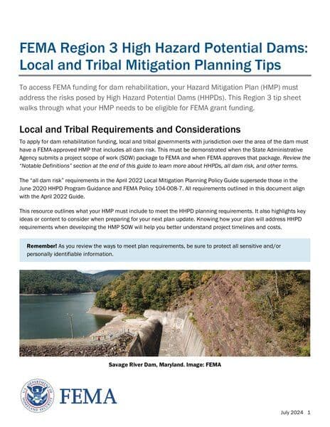 The resource provides guidance on local and tribal mitigation planning for High Hazard Potential Dams (HHPDs) to access FEMA funding for dam rehabilitation. It emphasizes the requirements for Hazard Mitigation Plans (HMPs) to address the risks posed by HHPDs to be eligible for FEMA grant funding. The document outlines the necessary components of the HMP, such as data sharing with state dam safety agencies, risk assessment, mitigation goals, and actions to reduce vulnerabilities from HHPDs.