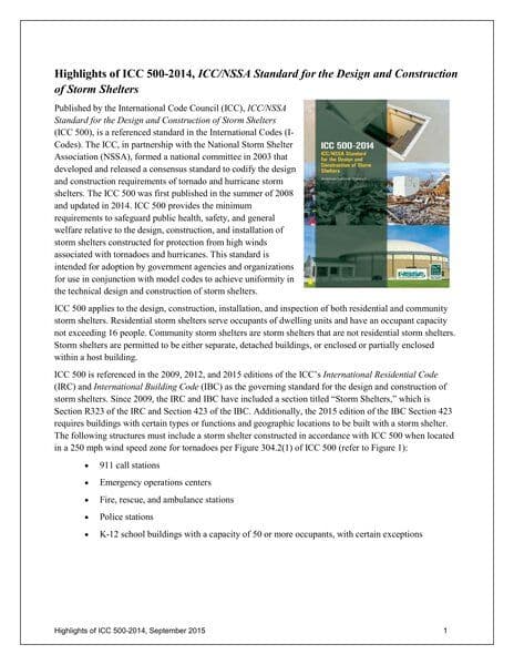 ICC 500-2014, ICC/NSSA Standard for the Design and Construction of Storm Shelters is a comprehensive standard published by the International Code Council (ICC) in partnership with the National Storm Shelter Association (NSSA) to codify the design and construction requirements for tornado and hurricane storm shelters. The 2014 edition emphasizes quality control, including requirements for peer reviews and special inspections. It covers various aspects such as administration, structural design criteria, siting requirements, occupancy, and essential features. The standard serves as a guiding document for the construction of storm shelters to ensure public health and safety during extreme weather events like hurricanes and tornadoes.