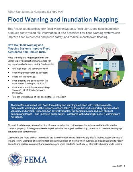 The FEMA Fact Sheet explains the role of flood warning systems and flood inundation mapping in conveying flood risk information to the public. It highlights how these systems enhance flood awareness, reduce risks, and provide advanced knowledge for effective response actions before and during flood events, ultimately reducing physical damage, indirect losses, and improving public safety.