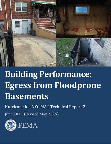 The technical report 'Building Performance: Egress from Floodprone Basements' provides observations and recommendations from FEMA's Mitigation Assessment Team (MAT) following Hurricane Ida's impact on New York City. It addresses the risks, requirements, and recommendations related to building egress and safety in flood-prone basements.