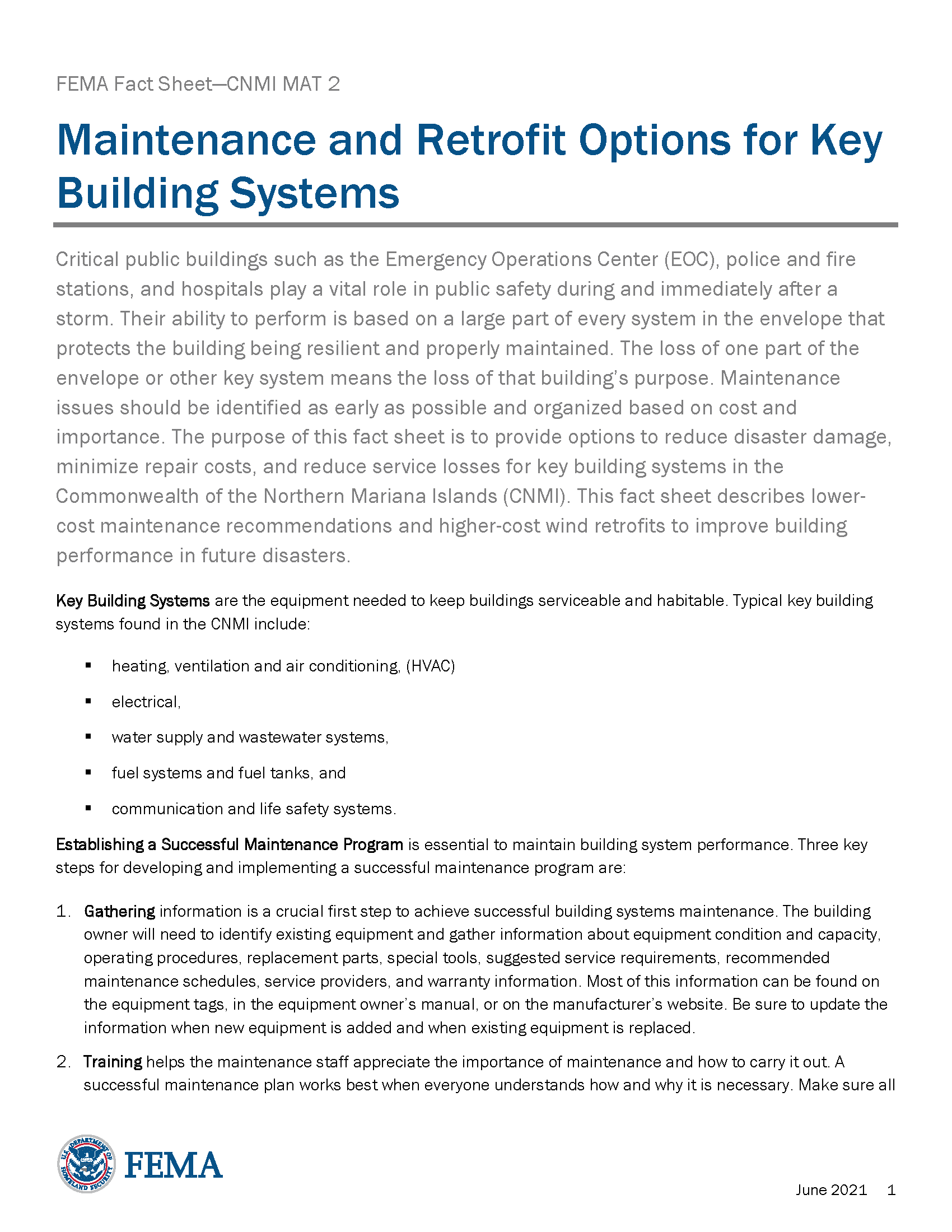The fact sheet provides maintenance and retrofit options to reduce disaster damage, minimize repair costs, and reduce service losses for key building systems in the Commonwealth of the Northern Mariana Islands (CNMI). It includes recommendations for maintaining HVAC, electrical, water supply, wastewater, fuel, and communication systems, as well as retrofit options to improve building performance during future disasters.