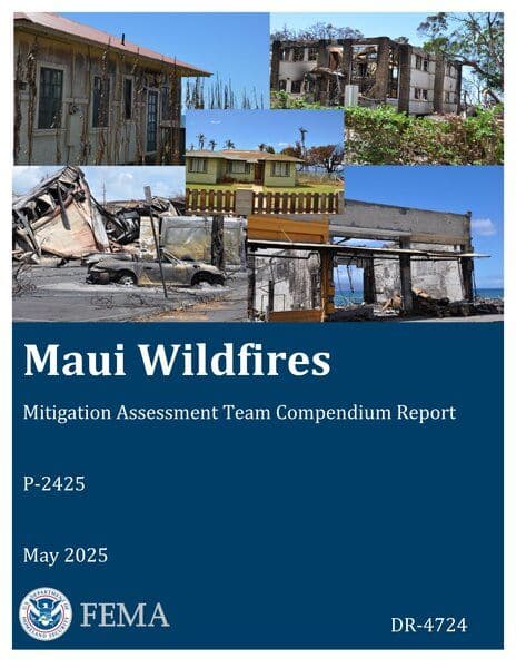 The Maui Wildfires Mitigation Assessment Team Compendium Report (P-2425) provides comprehensive guidance on designing new residential structures to mitigate wildfire risks, especially for one- and two-family dwellings. It emphasizes fire safety recommendations for design professionals to reduce ignition likelihood and structure-to-structure fire spread. The report advocates for best practices during the design phase to enhance fire resistance in densely developed neighborhoods in Maui, while also addressing multi-hazard considerations due to Maui's exposure to high winds, flooding, tsunamis, and seismic events.