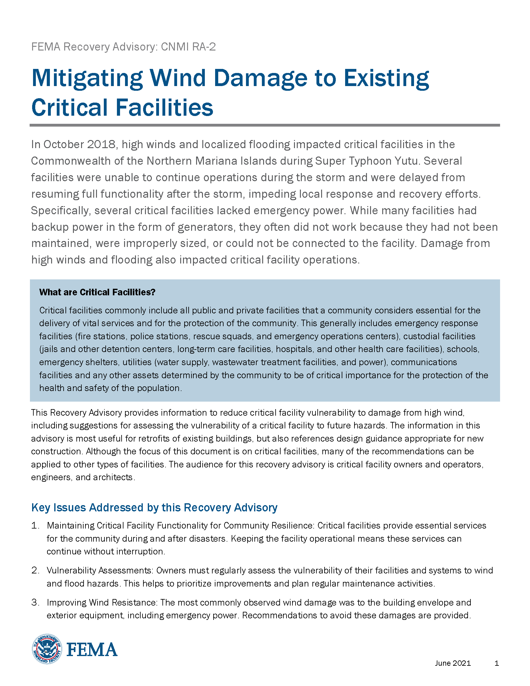 This Recovery Advisory provides information to reduce critical facility vulnerability to damage from high wind, including suggestions for assessing the vulnerability of a critical facility to future hazards. The information in this advisory is most useful for retrofits of existing buildings, but also references design guidance appropriate for new construction.