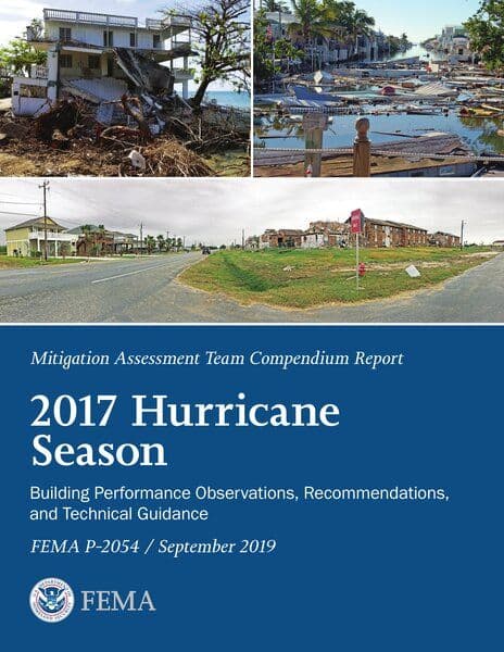 The Mitigation Assessment Team Compendium Report for the 2017 Hurricane Season focuses on building performance observations related to flood and wind hazards. The report discusses various damages observed in buildings, building equipment, and structure exteriors caused primarily by flooding and high winds from hurricanes. Detailed information includes observations on flood damage outside regulatory floodplains, performance of residential buildings against floods, structural stability, erosion, scour, flood-resistant materials, slope stability, and elevations. The report also covers observations on wind hazard-related damages, topographic effects on wind speeds, structural systems resistance, roof coverings, exterior wall coverings like brick veneer and vinyl siding, and damage to soffits.