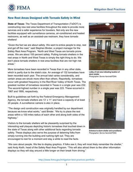 The Texas Department of Transportation (TxDOT) is constructing new rest area facilities equipped with tornado shelters throughout the state, particularly in tornado-prone areas of North and West Texas. These shelters are designed based on FEMA guidelines to accommodate at least 20 people and include surveillance cameras, ensuring a safer experience for travelers. The initiative highlights the importance of safety in tornado-prone regions and encourages travelers to utilize these facilities.